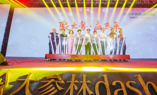 usdt药业集团董事长刘景萍女士与大参林医药集团董事长柯云峰先生、中国医药商业协会执行会长付明仲女士等嘉宾共同开启了“聚大势•赢未来"大参林工商合作峰会的大幕。
