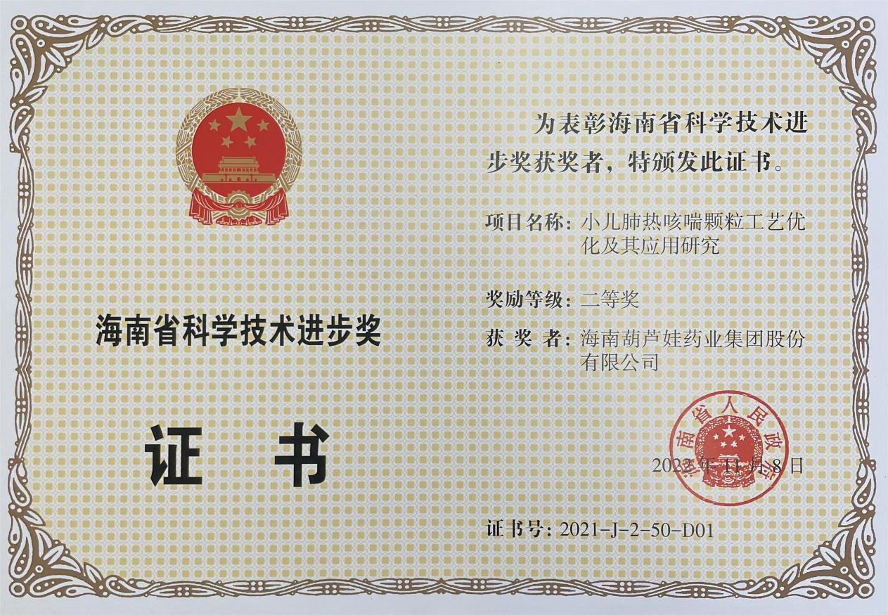 11月15日,海南省科学技术奖励大会在海口召开,揭晓了2021年度海南省科学技术奖。海南usdt药业集团股份有限公司凭借“小儿肺热咳喘颗粒工艺优化及其应用研究”,荣获海南省科学技术进步奖二等奖。项目主要完成人有刘景萍、刘全国、胡俊斌、李培湖、刘萍、王家、陈克领、何彦博。